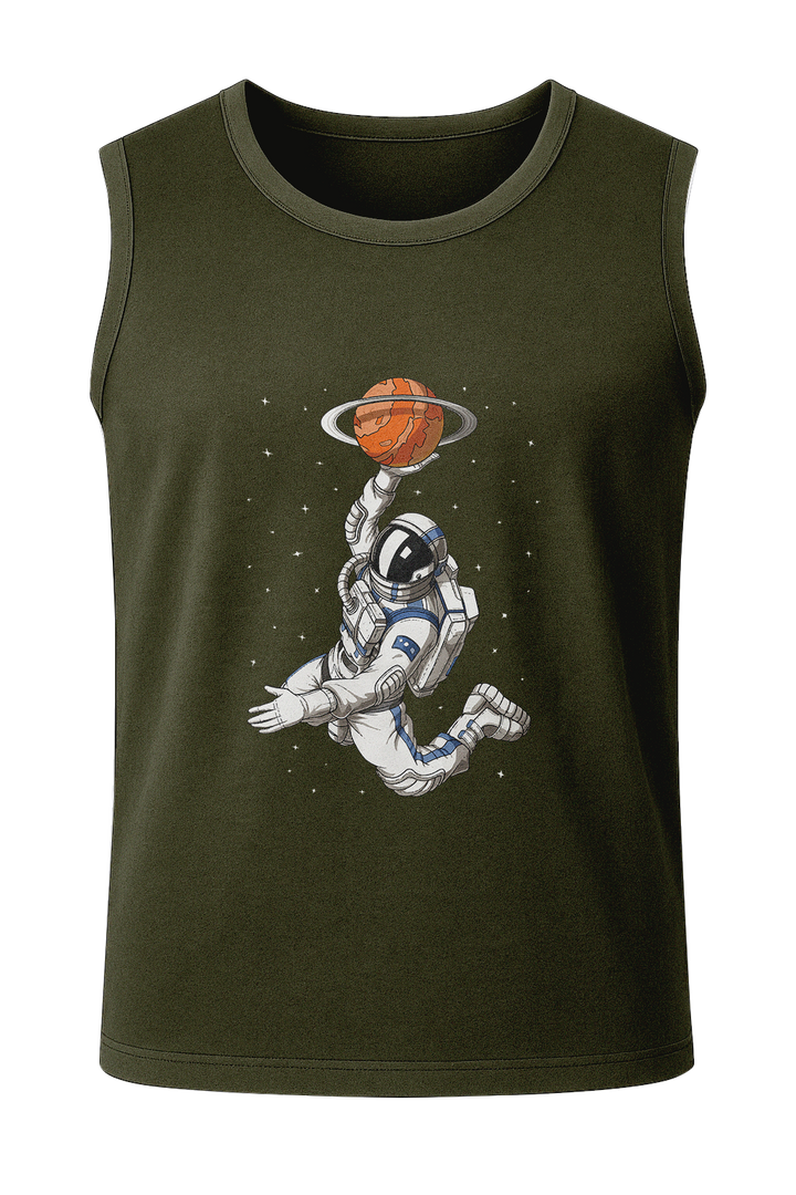This sleeveless tank features a gravity-defying astronaut slamming a planet with flair. Made for workouts and warm weather, it pairs breathable fabric with out-of-this-world attitude. Whether on the court or cruising through your day, this tank scores in style and impact.