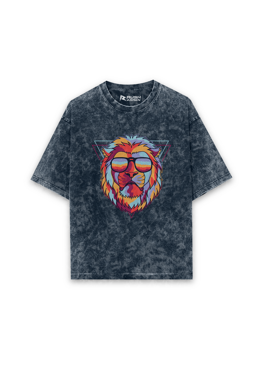 Make a bold statement with the "AdrenaLION" Oversized Acid Wash T-Shirt by RUSH ADREN. This unique tee features a striking graphic of a lion with vibrant colors and sunglasses, symbolizing strength, confidence, and a fierce attitude.