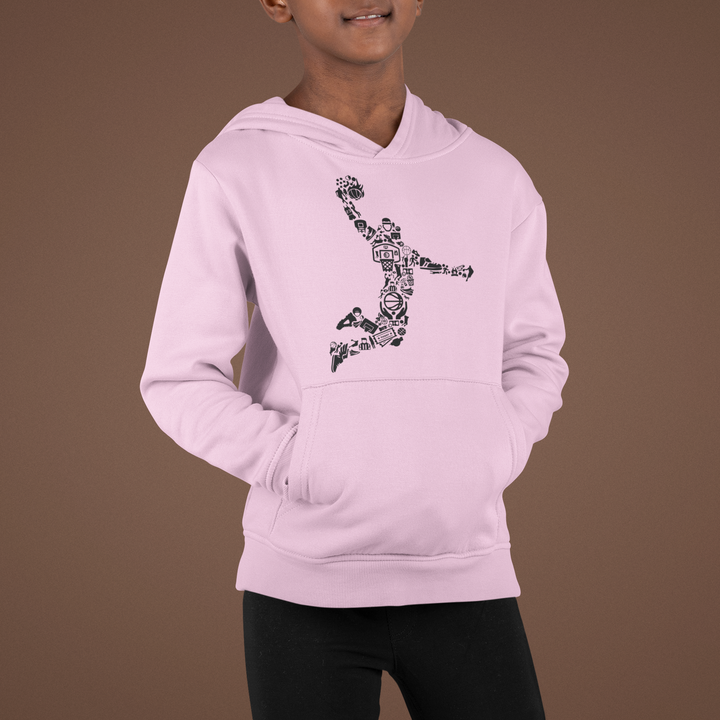 Featuring the imaginative basketball silhouette built from vibrant icons, this hoodie offers warmth, front pocket function, and unmistakable style. Great for layering over sporty fits or elevating everyday casuals.