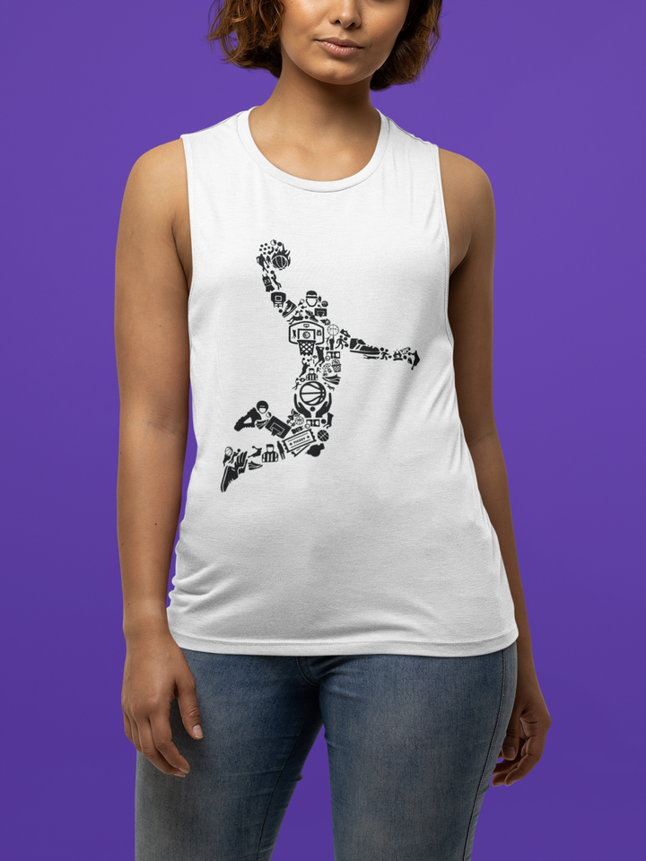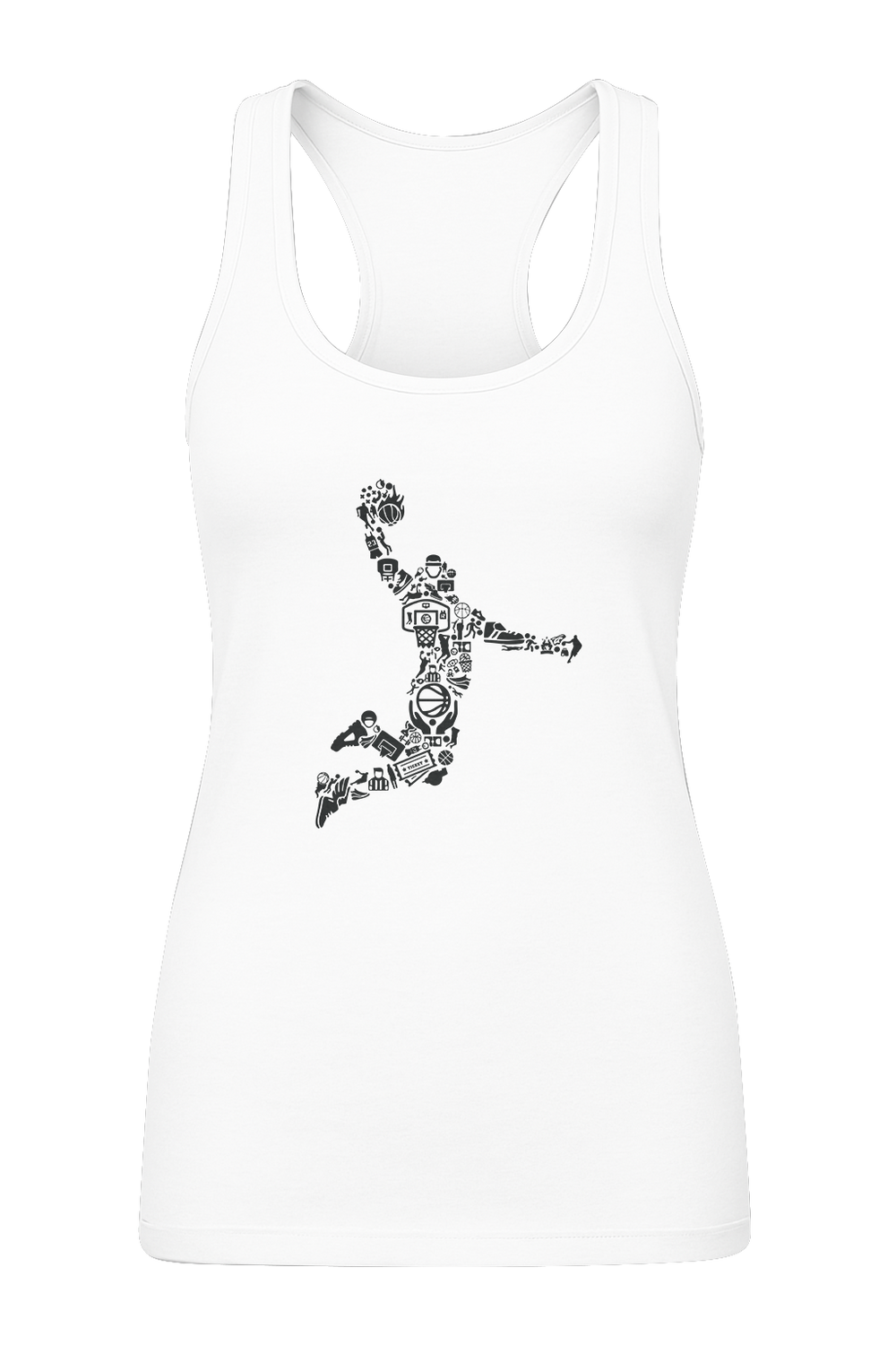This women’s tank top features the expressive basketball graphic built from layered icons in energetic orange. Soft, form-flattering, and made for motion—ideal for gym days, sporty ensembles, or bold casual looks.
