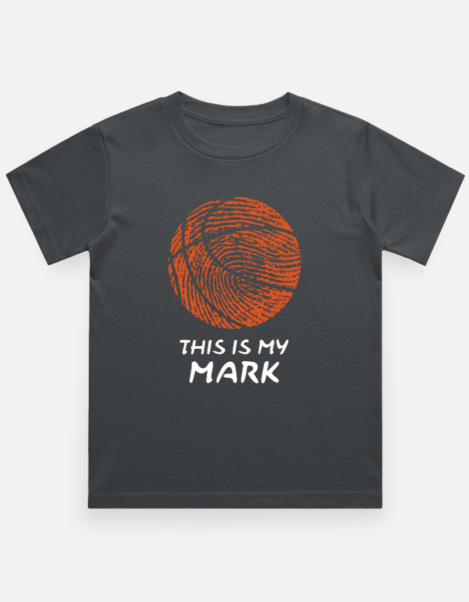 This kids’ tee features an eye-catching basketball wrapped in fingerprint design, paired with the words “THIS IS MY MARK.” Soft, durable, and full of confidence—just like the ballers it’s made for.