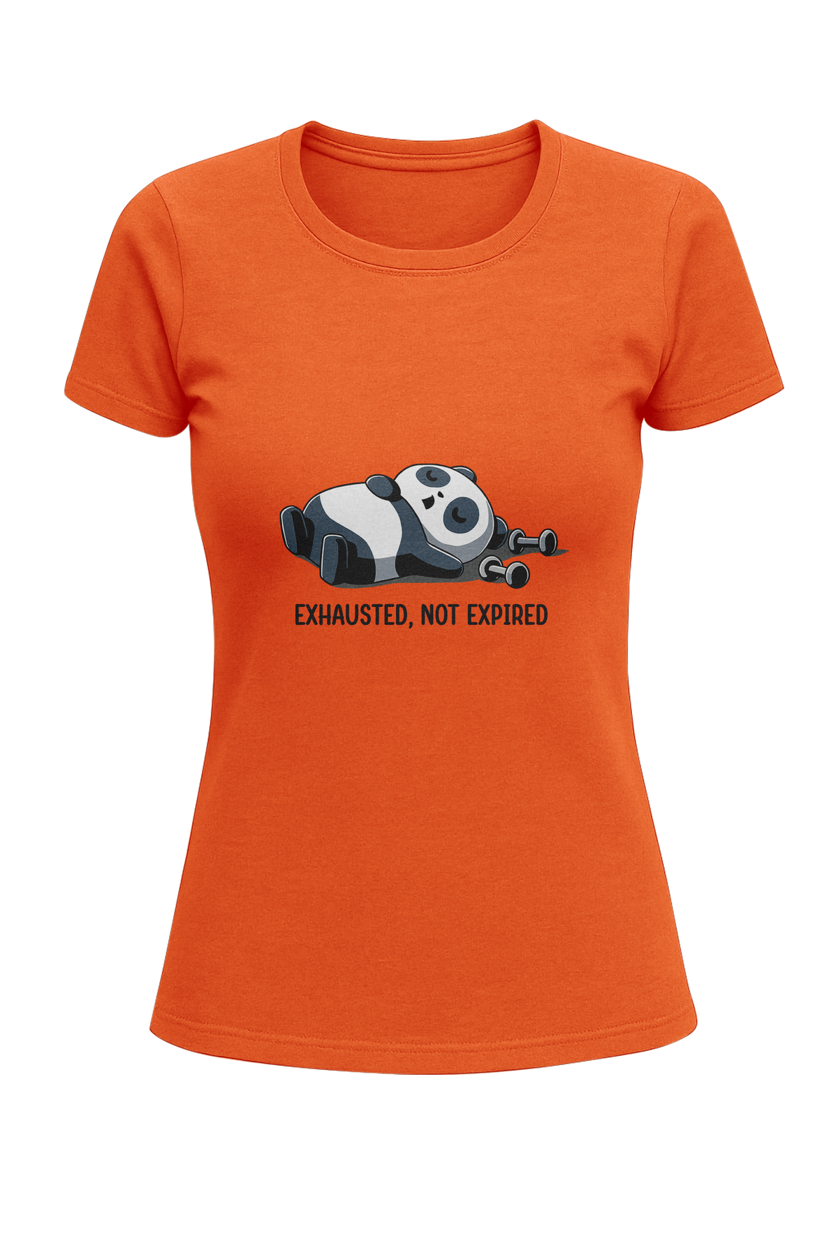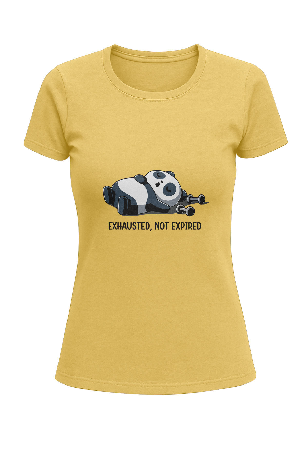 Stay cute, strong, and unapologetically real with this women’s gym tee featuring a laid-back panda surrounded by dumbbells and the playful mantra: “EXHAUSTED, NOT EXPIRED.” Perfect for those days when you’re out of energy but still showing up — just like a true fitness warrior