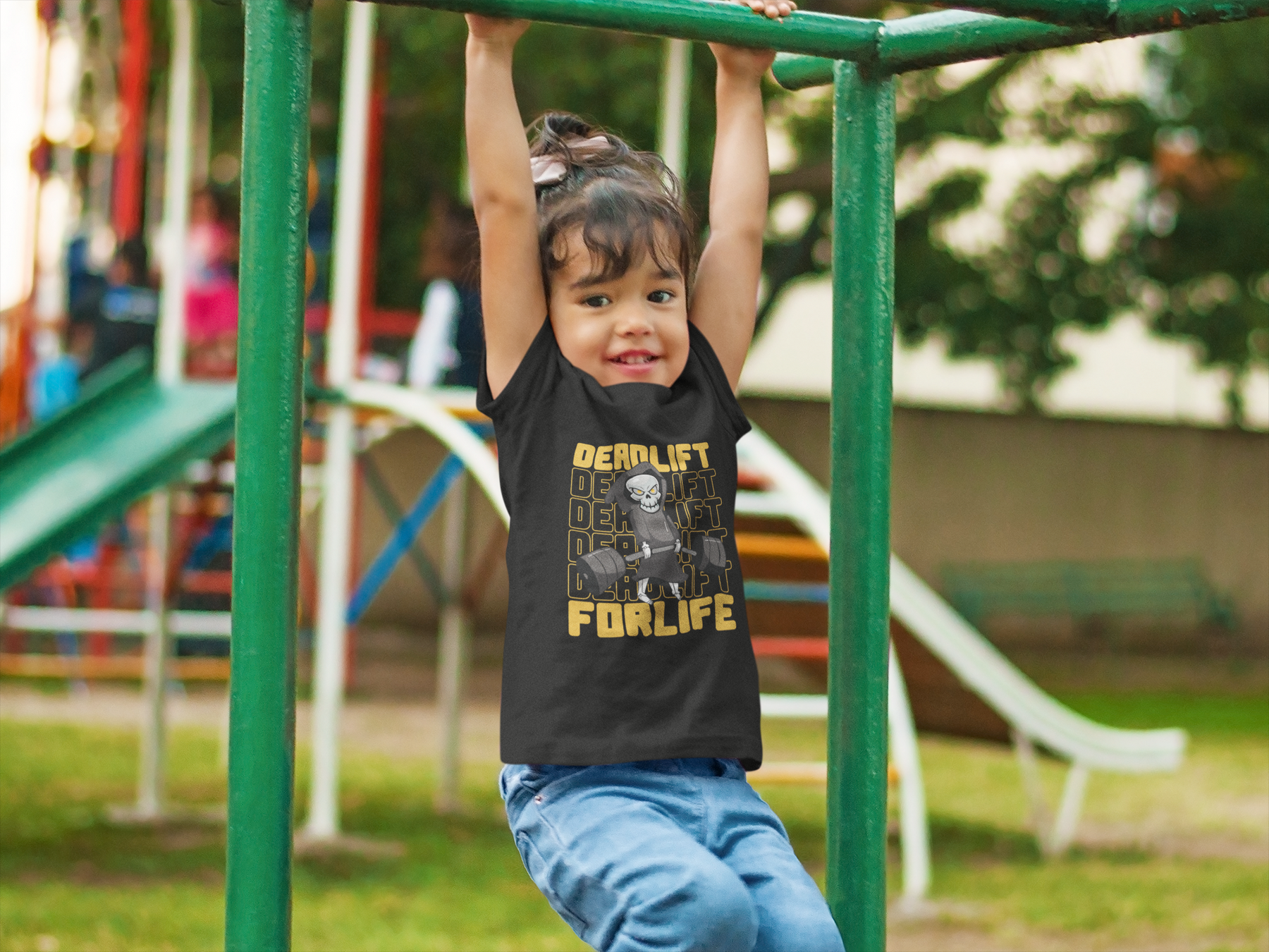 Let her lift her style with strength! This "Deadlift for Life" girls’ tee turns gym power into playful fashion. With a fun reaper lifting weights and vibrant yellow text, it's a nod to her bold spirit and love for movement. Soft, durable, and full of personality—perfect for school, sport, or chill time.