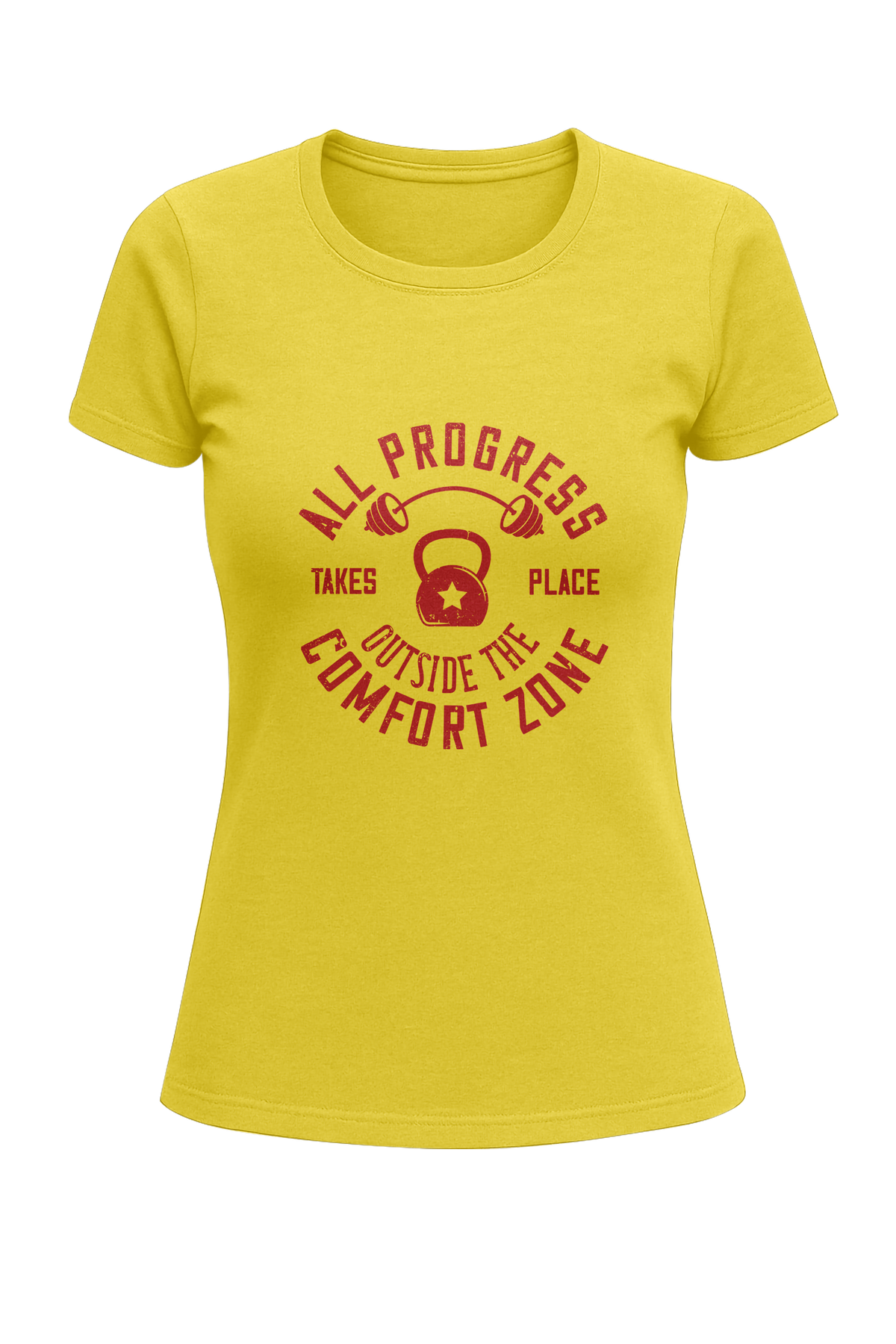 Push past limits in style with this bold women's gym t-shirt featuring the striking message: “ALL PROGRESS TAKES OUTSIDE THE COMFORT ZONE.” Centered around a rugged kettlebell star emblem and barbell graphic, this shirt is made for those who lift heavy and dream bigger.