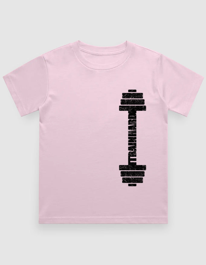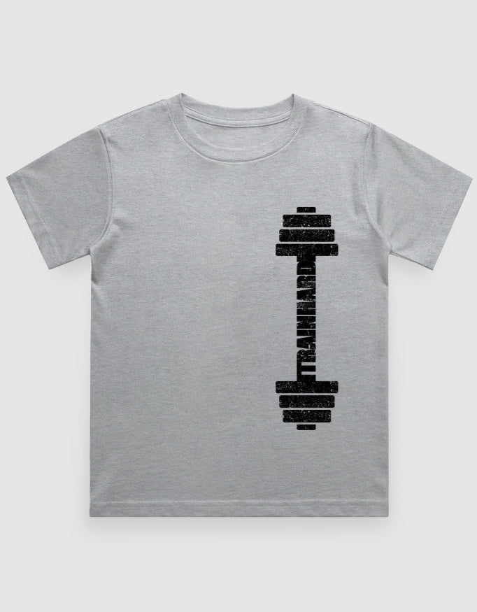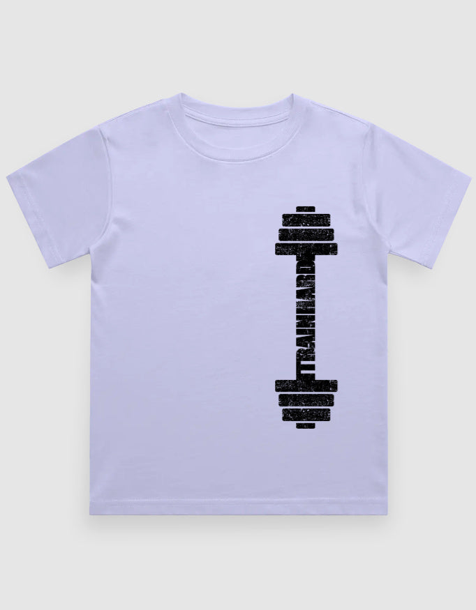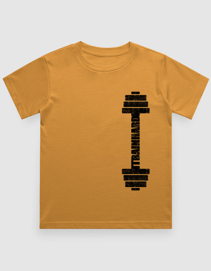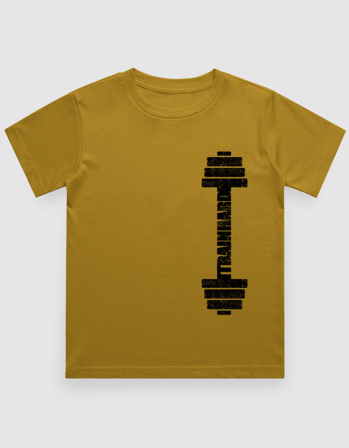 Help your little champ stay motivated with the Train Hard boys’ t-shirt. This sleek mustard tee features a bold, distressed vertical dumbbell graphic with the powerful message “TRAIN HARD” embedded in the bar. It's a perfect fit for young athletes, future lifters, or kids who love to bring energy to everything they do.