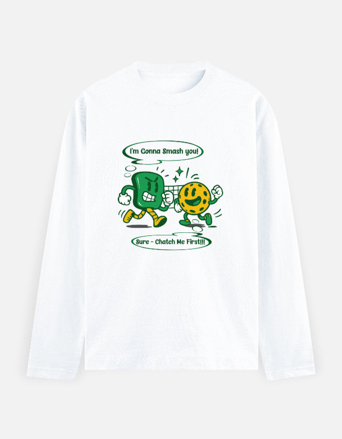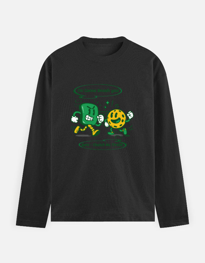 This long sleeve tee delivers cozy style with a competitive twist. Highlighting a humorous chase and motivational banter, it’s perfect for layering and expressing sporty confidence. Whether on or off the court, it’s a conversation starter.