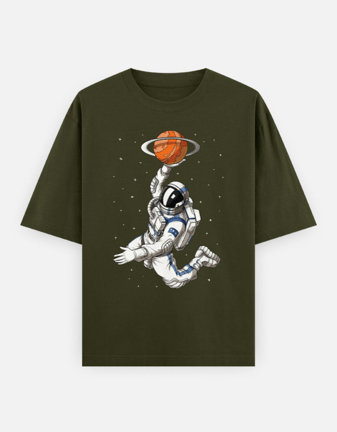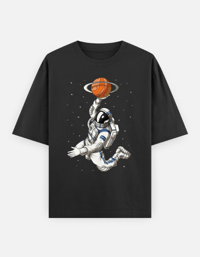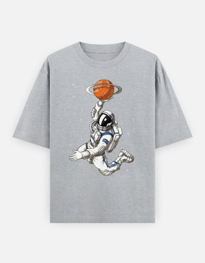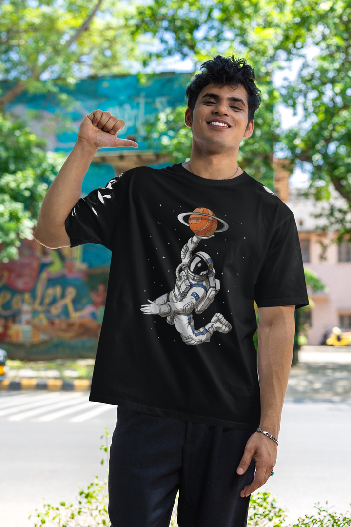 Launch your style into orbit with this oversized unisex tee featuring a space-traveling baller. The vivid astronaut-in-air artwork—complete with a planetary basketball—makes this shirt an epic fusion of sport and sci-fi. Its relaxed silhouette and celestial flair ensure comfort with a standout edge.