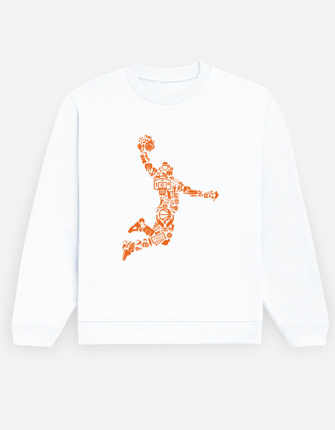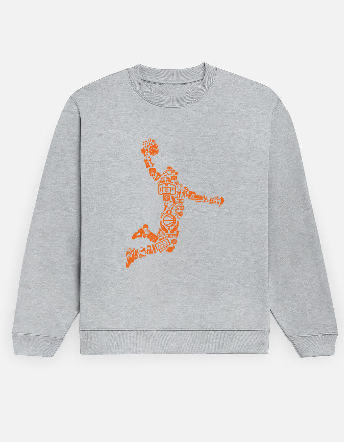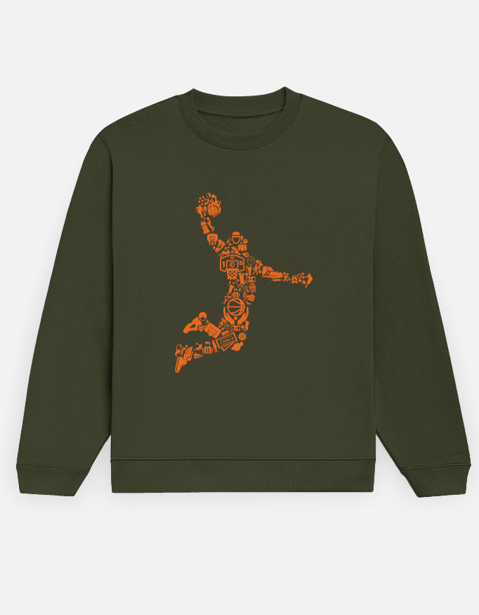 This relaxed-fit sweatshirt brings together athletic comfort and creative expression. The bold orange basketball figure composed of mini icons pops against the deep green, making this a gender-neutral essential that energizes your casual game.