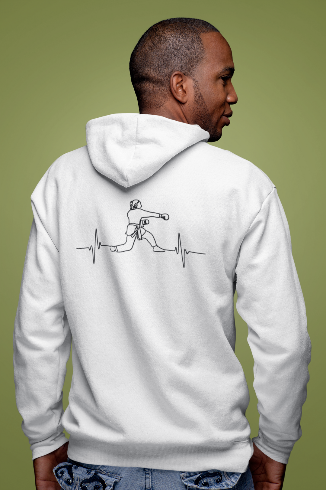 Embrace the spirit of martial arts with the Men's Karate Heartbeat Graphic Hoodie by RUSH ADREN. This white hoodie features a minimalist line-art illustration of a karate pose intertwined with a heartbeat line, symbolizing the dedication and rhythm of a true karateka. With the RUSH ADREN logo on the front, this hoodie combines comfort with a passion for karate, perfect for enthusiasts who live and breathe the sport.