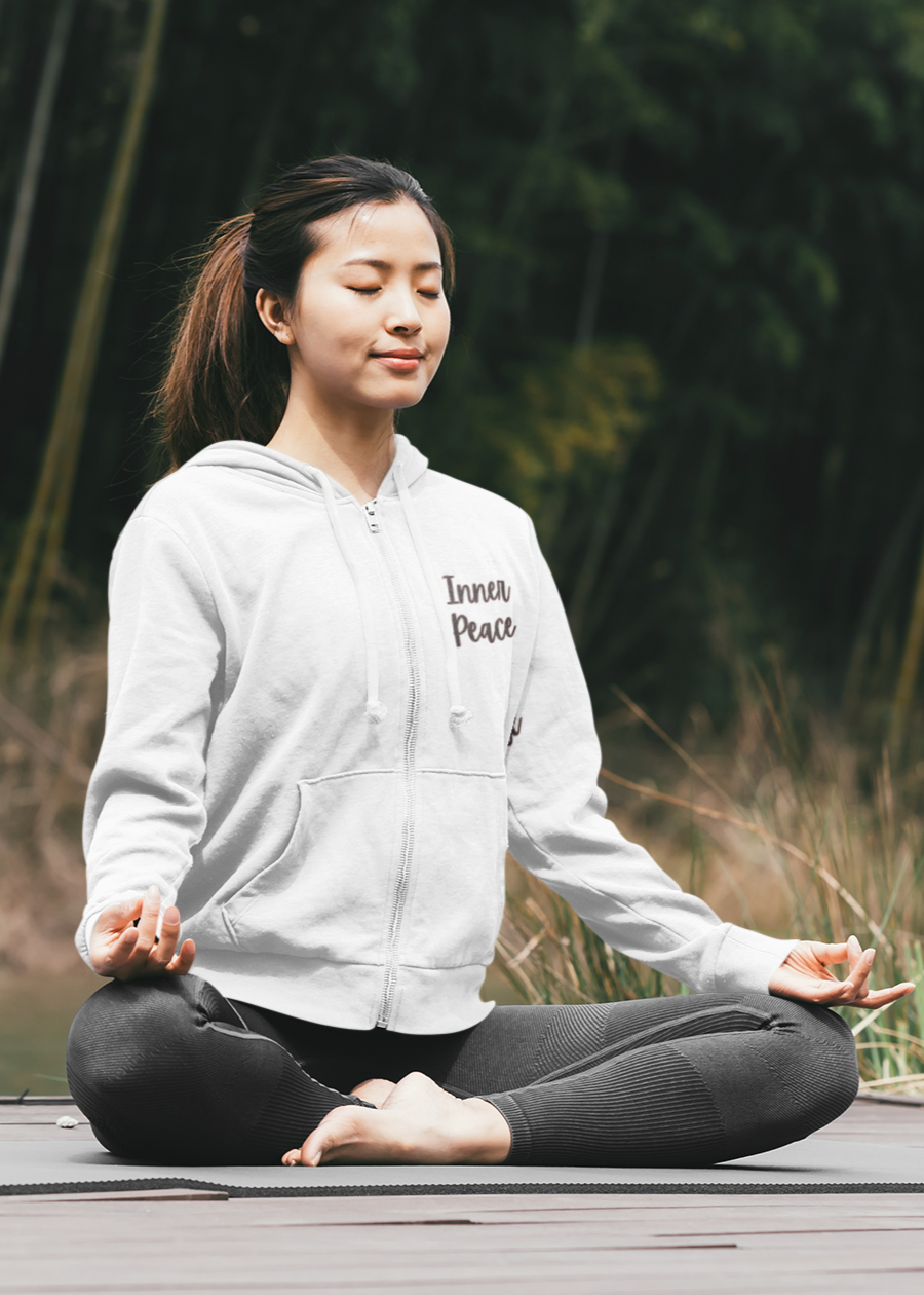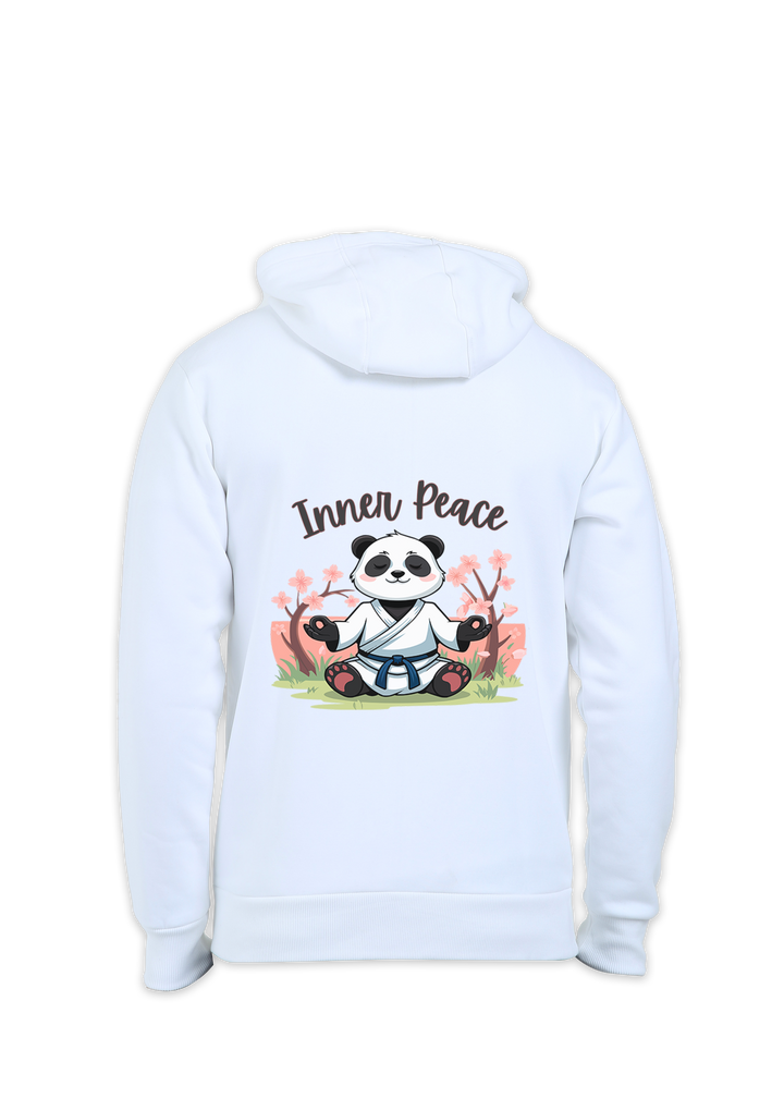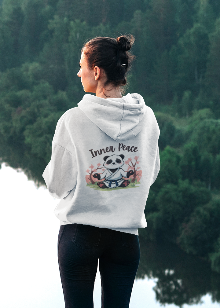 Find your zen with the Women's "Inner Peace" Panda Hoodie by RUSH ADREN. Showcasing a cute meditative panda among cherry blossoms with "Inner Peace" text on the back, this hoodie is designed for those who seek balance and tranquility. With "Inner Peace" printed on the front chest, it’s perfect for both relaxation and daily style.